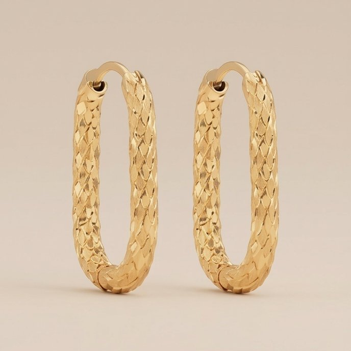 Inspiradas nos reflexos luminosos do ouro, estas argolas apresentam um design elegante e contemporâneo, onde cada detalhe foi pensado para criar brilho e profundidade. A sua forma sofisticada e a textura gravada conferem-lhes personalidade, tornando-as uma peça marcante e ao mesmo tempo intemporal.