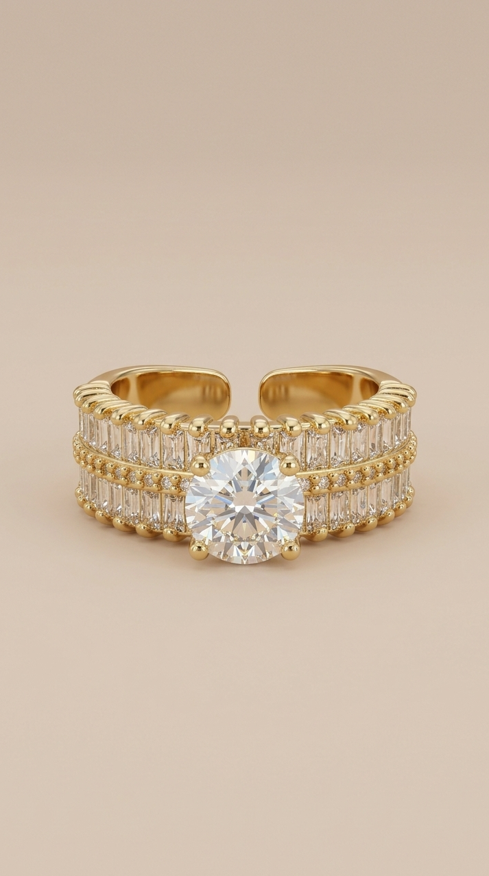 Com um design robusto mas refinado, apresenta uma cravação central de destaque rodeada por micro-zircónias que captam a luz de todos os ângulos, proporcionando um brilho realista e sofisticado.