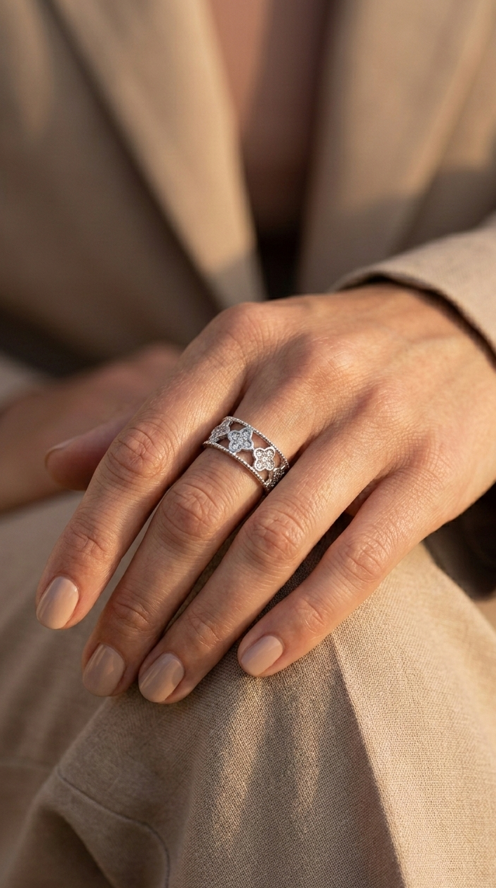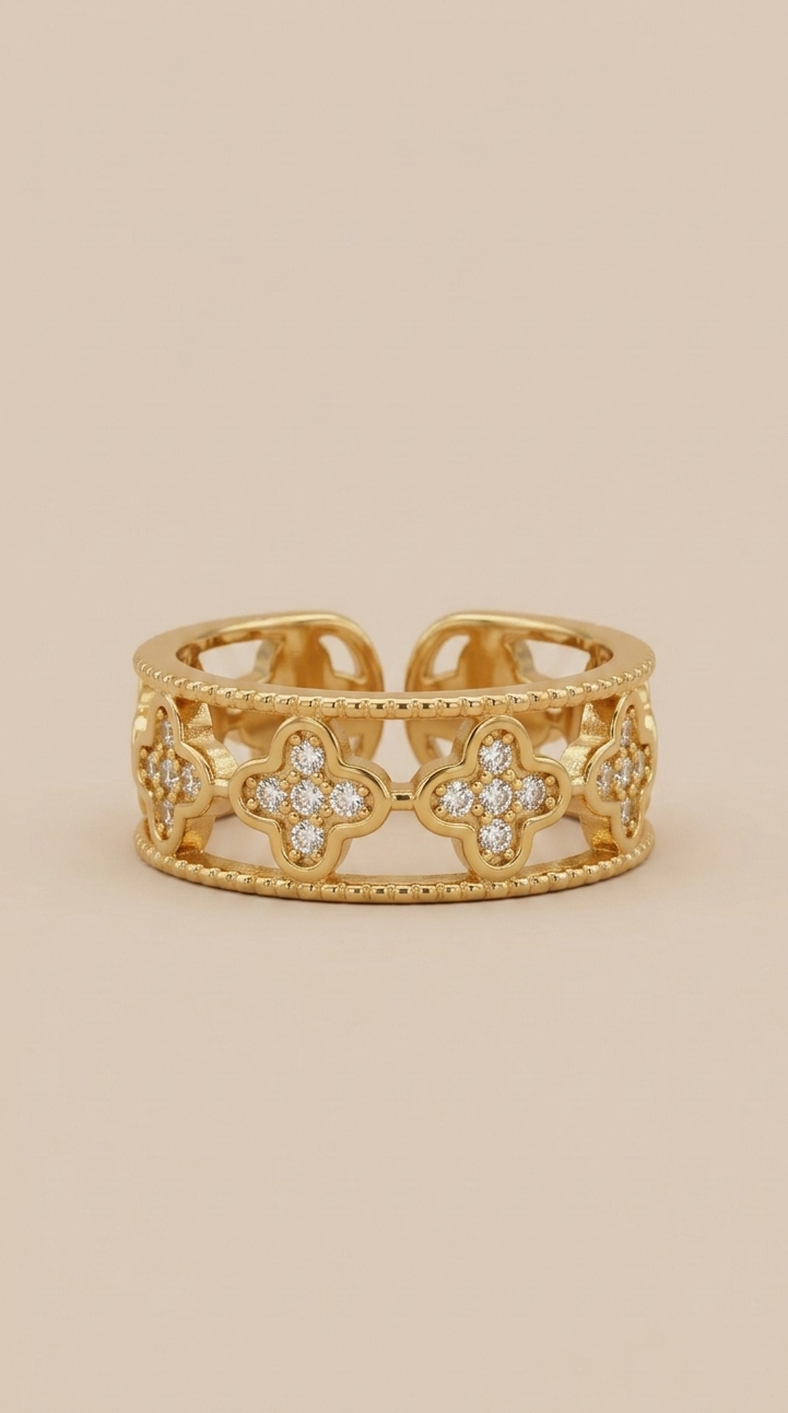 Eleve o seu estilo com o Anel Firina, uma peça que define o conceito de "quiet luxury". Com um design vazado de trevos delicadamente trabalhados e cravejados com zircónias de alto brilho, este anel é a fusão perfeita entre a sofisticação clássica e a durabilidade moderna.