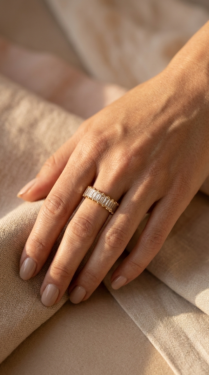 - Brilho Premium: Cravejado com zircónias de alta qualidade em corte retangular (baguette), que oferecem um reflexo nítido e luxuoso semelhante ao diamante.