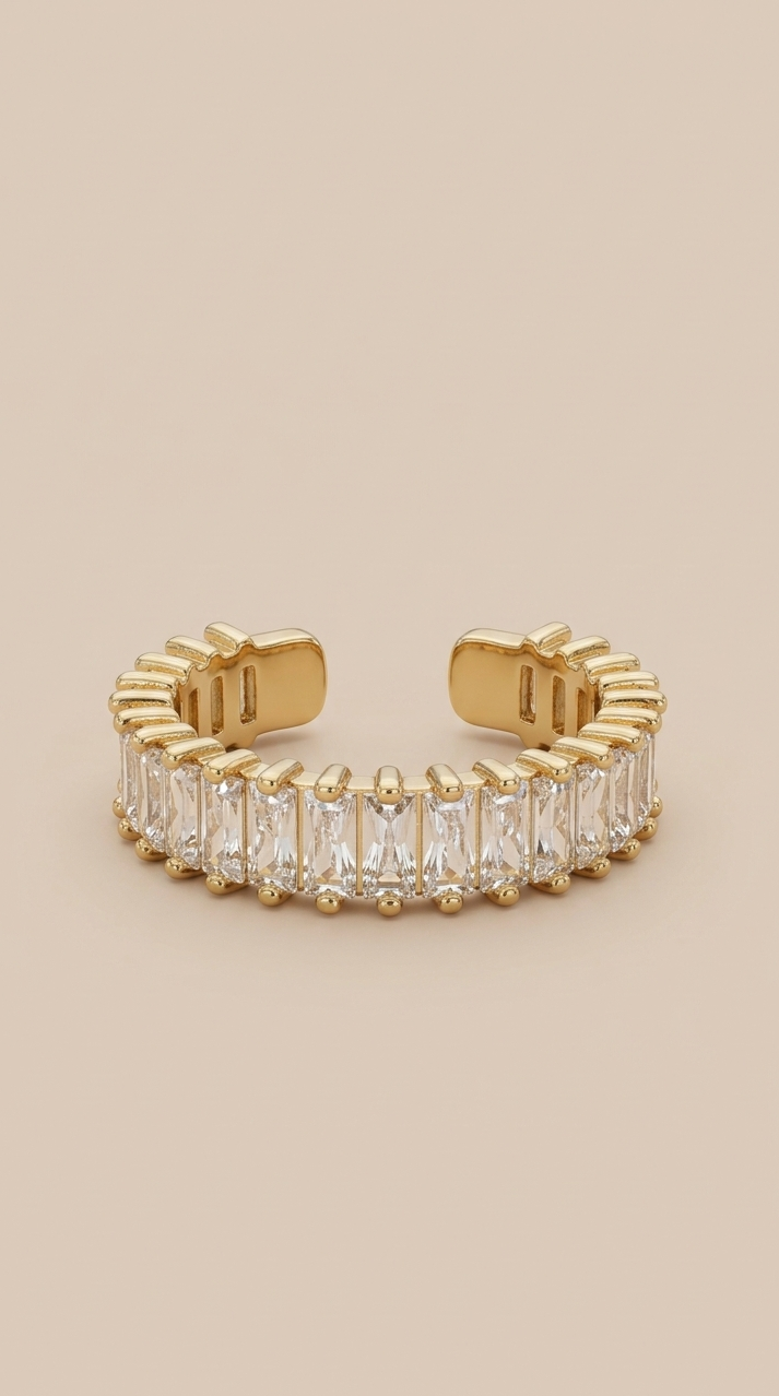 Eleve o seu estilo com o Anel Aurora, uma peça que personifica o conceito de quiet luxury. Com um design de aro aberto e moderno, este anel apresenta uma sequência contínua de zircónias em corte baguette, capturando a luz de todos os ângulos com um brilho sofisticado e atemporal.